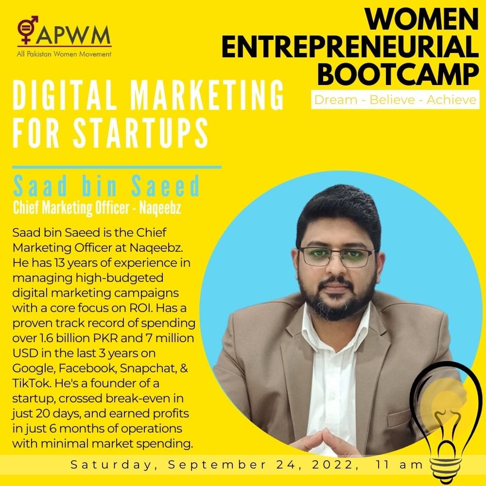 Digital Marketing is essential in the present age to scale ventures and increase sales. This week our participants from Women Entrepreneurial Bootcamp 2022 will be trained on “Digital Marketing for Startups” by Saad bin Saeed, Chief Marketing Officer Naqeebz.